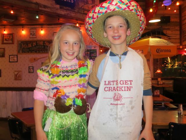 B was out of town and the kids wanted to go to Joe’s Crab Shack. I think it’s all because they dress them up, make them stand on a chair and the whole staff sings to them. I don’t think we’ve ever gone there NOT on a birthday. I think Ari’s coconut bra is more like an 82 year old than a 12 year old….