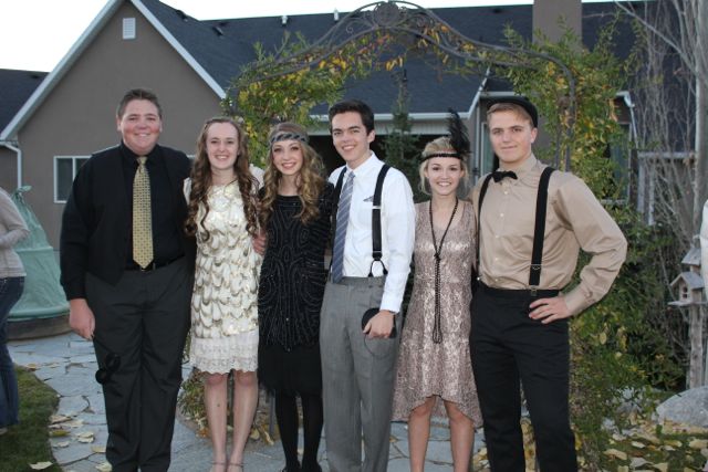 11/2/13 Gastby Masquerade Ball. This was a girl ask guy dance & Lelu went with Tanner this time and 18 other kids including Chandler and two more boys from our old ward. Where else but UT would you see 20 kids ready for a dance and 40 parents in a backyard taking photos?