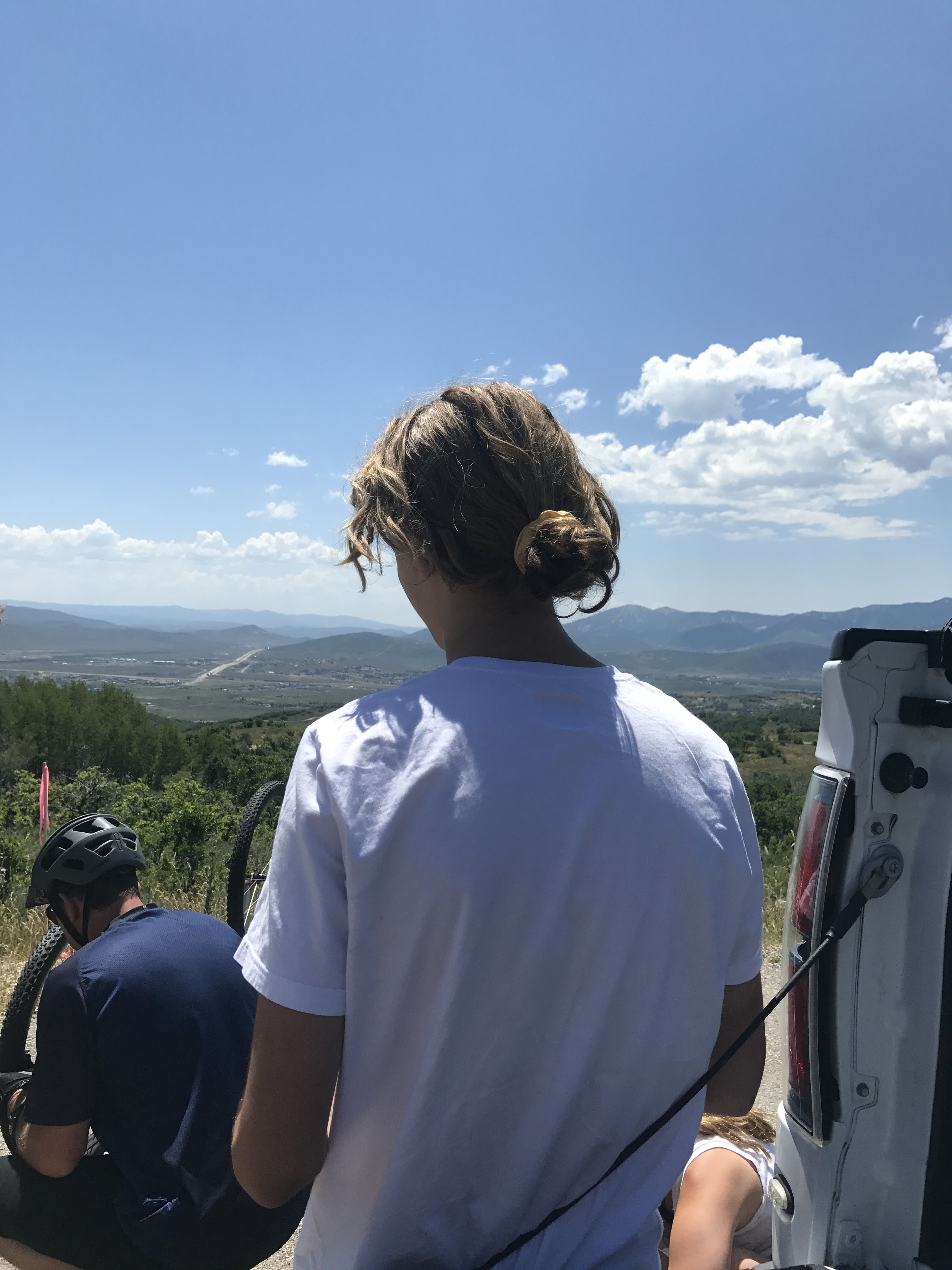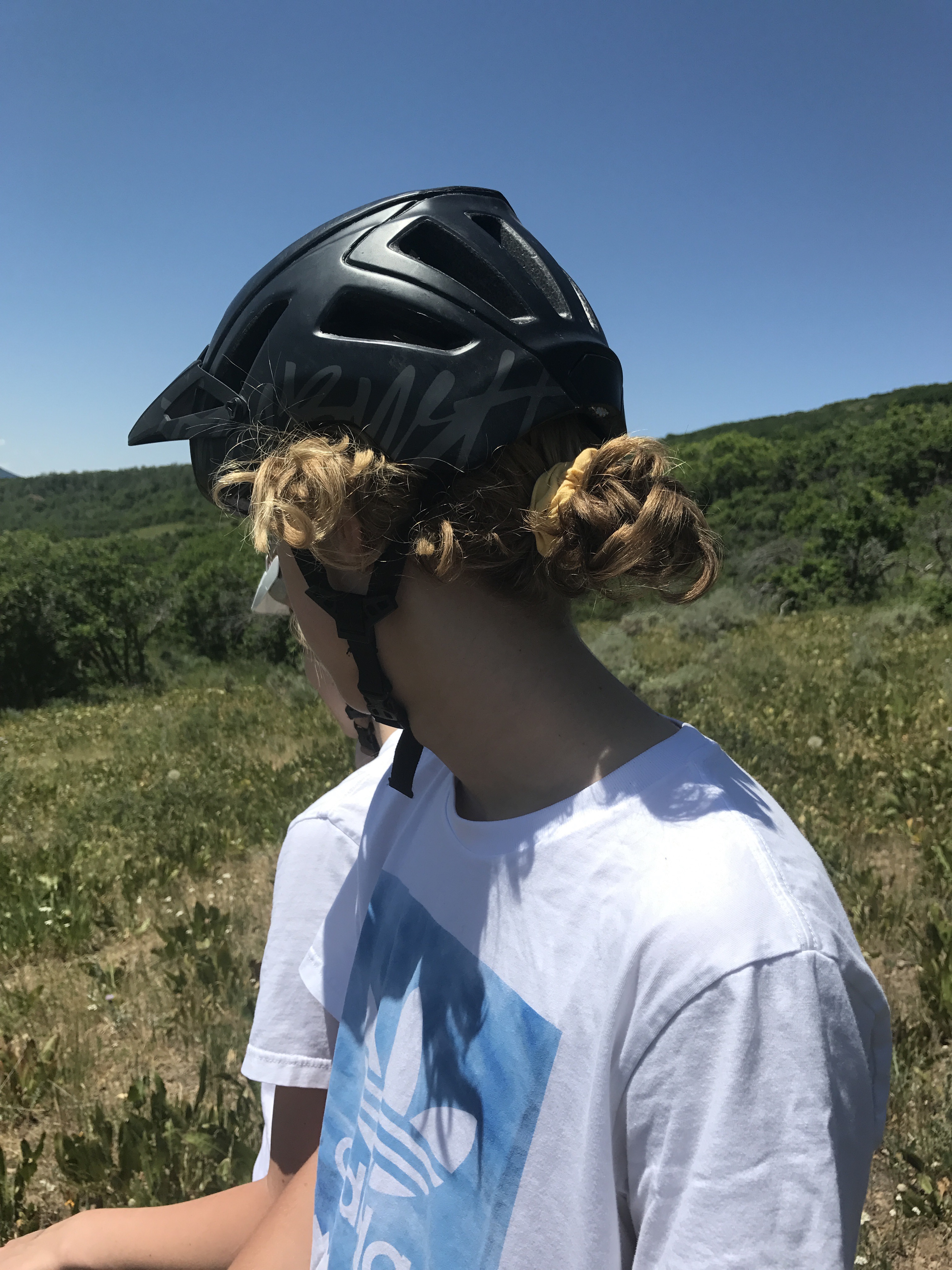 This was the only photo I captured before we started up to the trail – TT’s stylish helmet hair. The scrunchy makes the look.