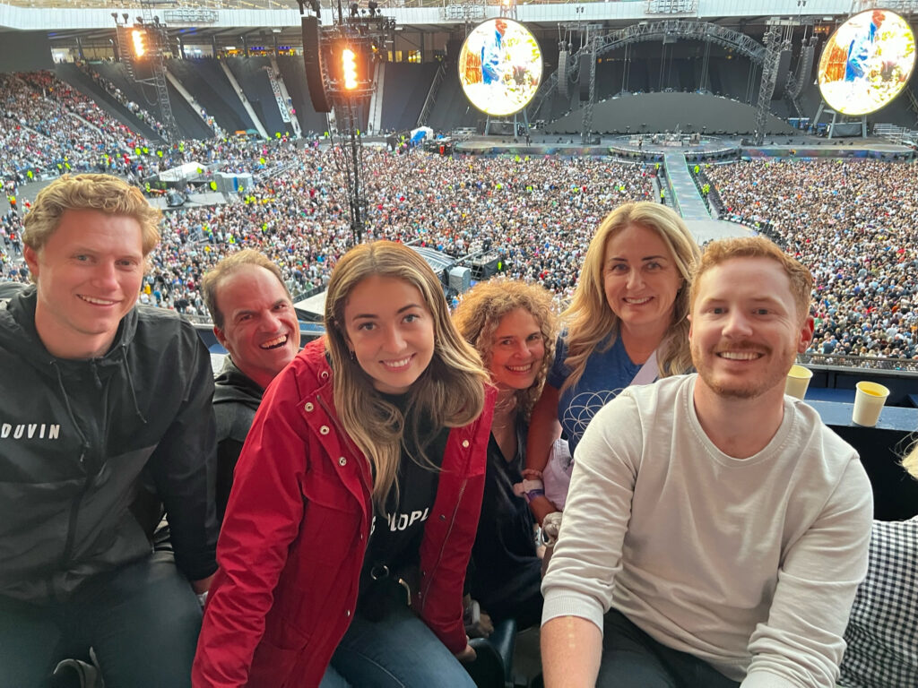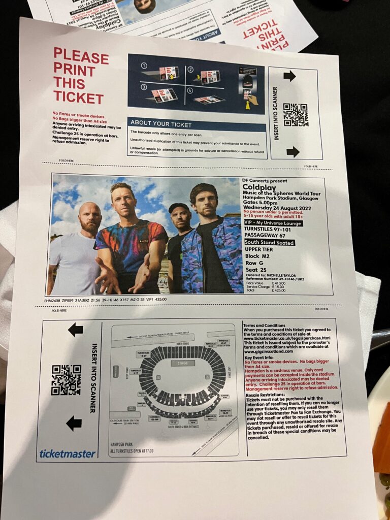 For the show, we forked out the big bucks and bought VIP tickets, which in past concerts have been totally worth it because you get very good seats. But this venue was completely different from what I am used to. It was massive!! We got a swag bag and dinner plus never ending drinks included but I’m pretty sure the farthest seats from the stage I’ve EVER been at any Coldplay concert. It was very hard to tell from the seating chart just how far away we really would be. The floor General Admission was HUGE! You could not get a seat close anywhere in that stadium. I couldn’t see the sweat dripping off his face or even really see his face but the concert was still so much fun! I love the light up wrist bands, the fireworks, the confetti and the overall joy of music I feel at these concerts.